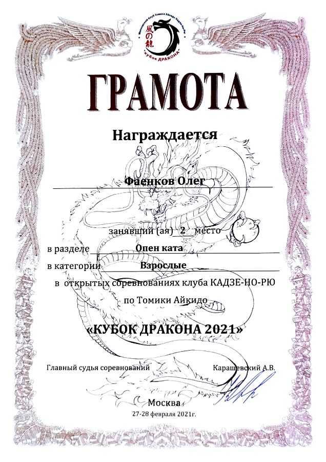 2021 г. - 2 место на межрегиональных соревнованиях по Томики Айкидо - "Кубок Дракона", в категории "Опен ката", Москва