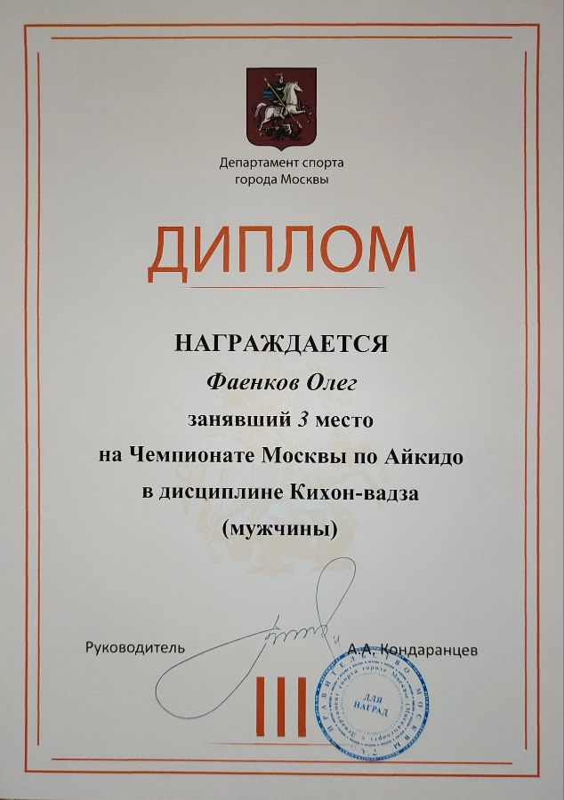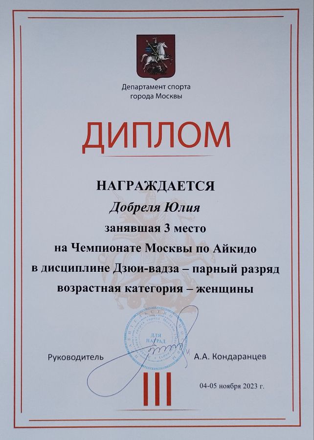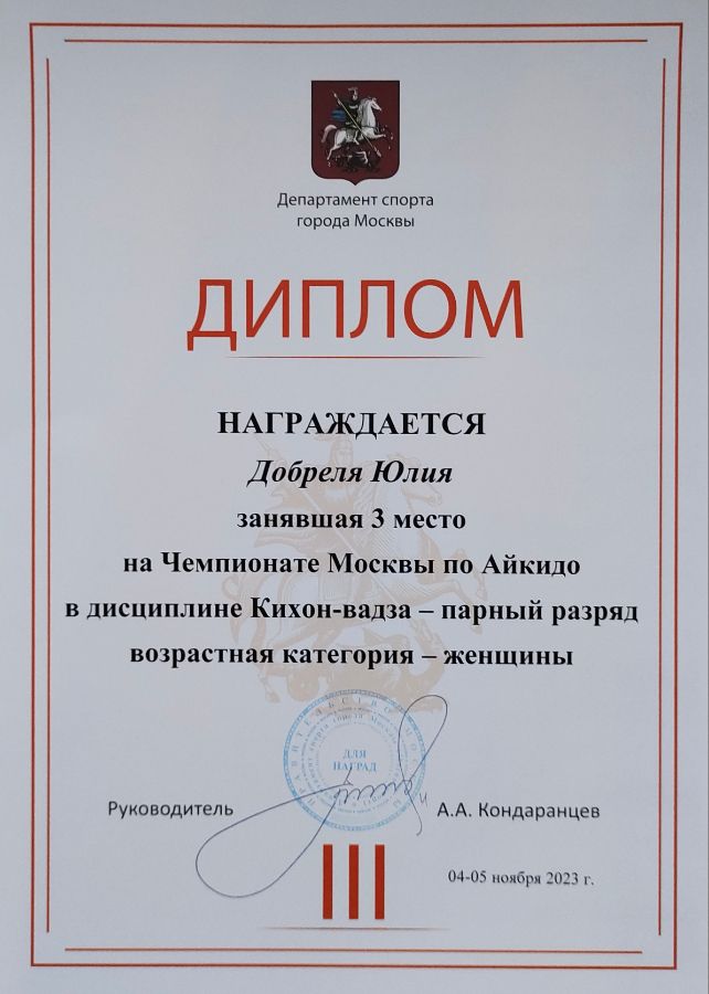 2023 г. - 3 место на Чемпионате Москвы по Айкидо, в категории "Дзюи-вадза", Москва