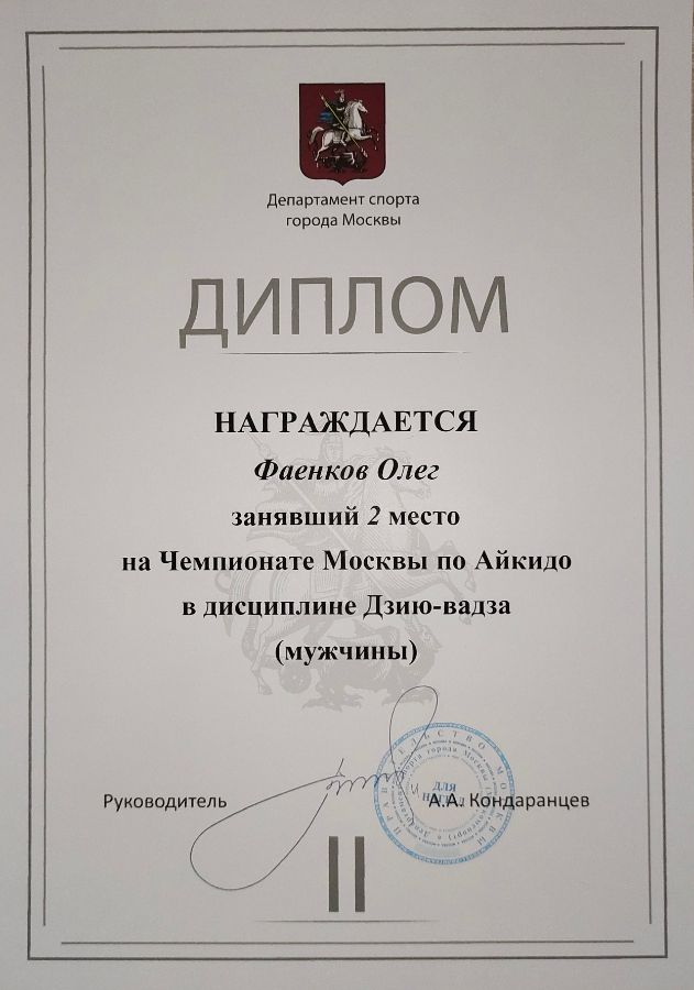 2023 г. - 2 место на первенстве Москвы по Айкидо, в категории "Дзюи-вадза", Москва