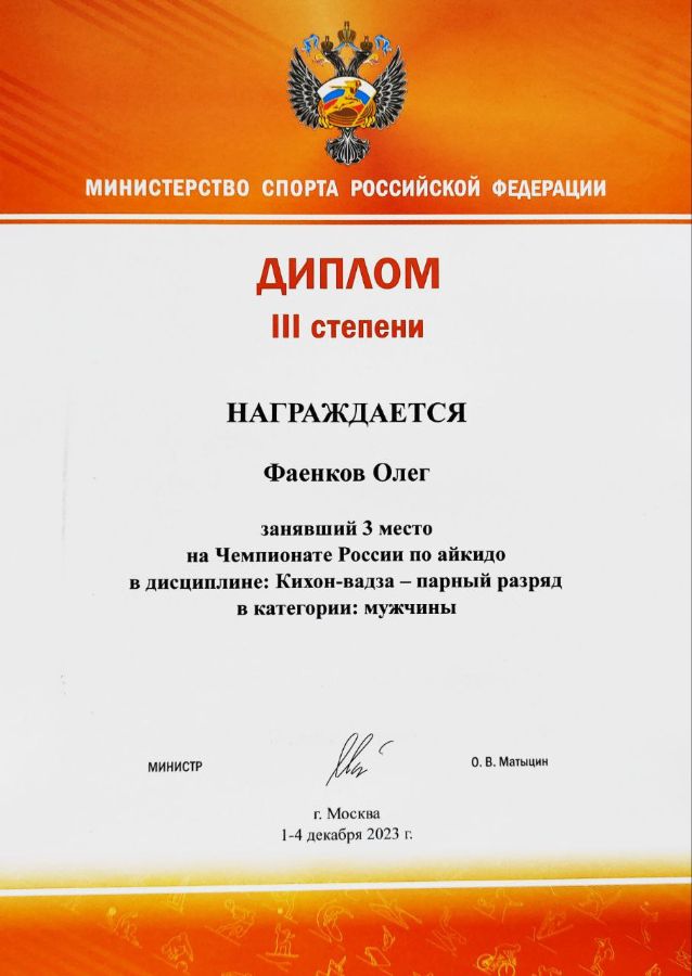 2023 г. - 3 место на Чемпионате России по Айкидо, в дисциплине "Кихон-вадза",Москва
