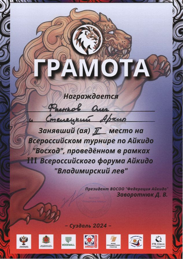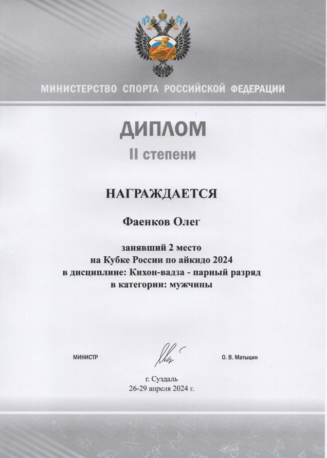 2024 г. - 2 место на всероссийских соревнованиях по Айкидо Ёсинкан, г.Суздаль