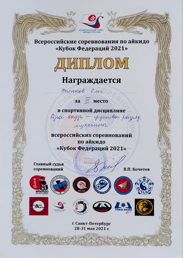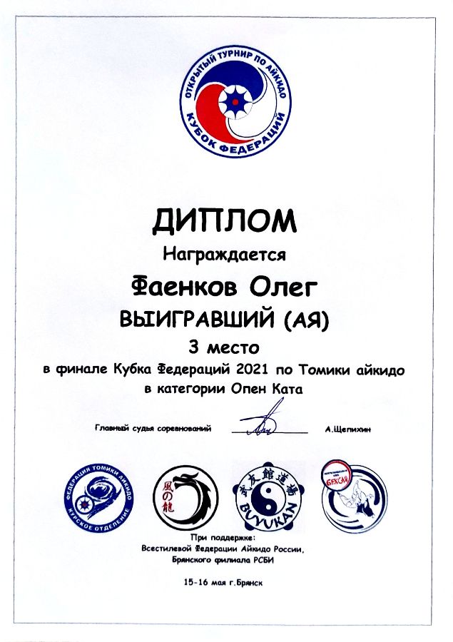 2021 г. - 3 место на всероссийских соревнованиях "Кубок Федераций 2021" по Айкидо, г.Санкт-Петербург