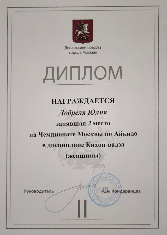 2023 г. - 2 место на пераенстве Москвы по Айкидо, в категории "Кихон-вадза", Москва