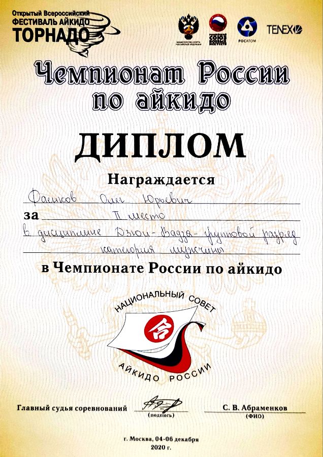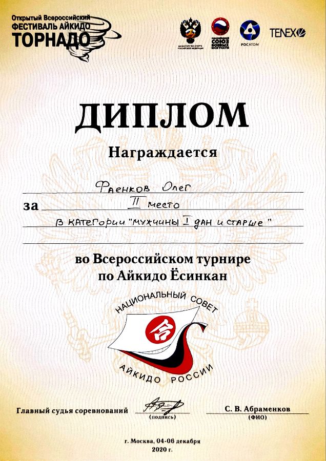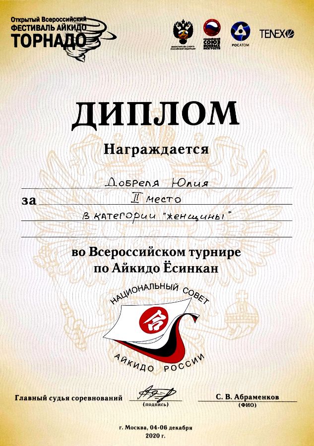 2020 г. - 2 место на Всероссийском турнире по Ёсинкан Айкидо, на Всероссийском фестивале Айкидо "ТОРНАДО 2020", Москва