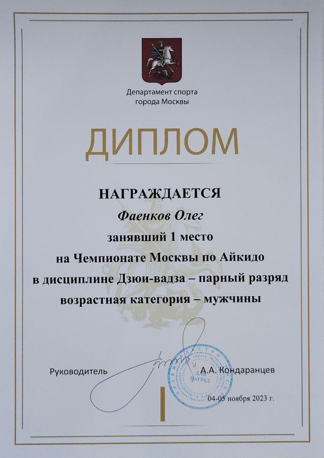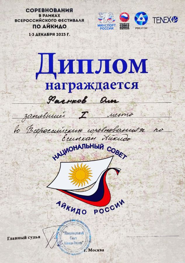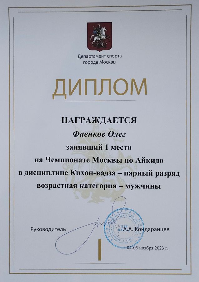 2023 г. - 1 место на Чемпионате Москвы по Айкидо, в категории "Дзюи-вадза", Москва