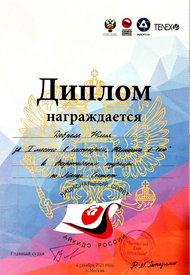 2021 г. - 1 место на Всероссийском турнире по Ёсинкан Айкидо, на Всероссийском фестивале Айкидо "ТОРНАДО 2021", Москва