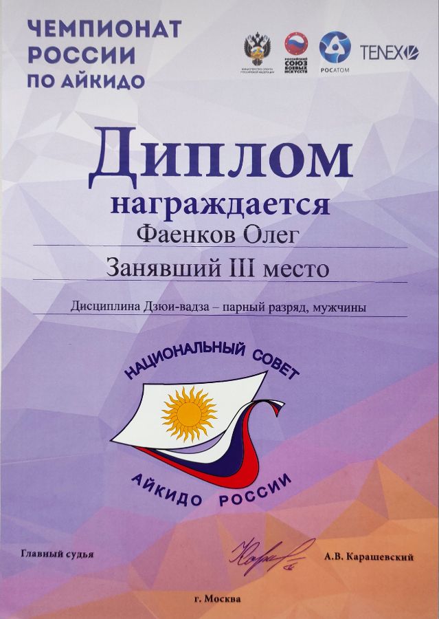 2021 г. - 3 место на Чемпионате России по Айкидо,в дисциплине Дзю-вадза (парный разряд), Москва