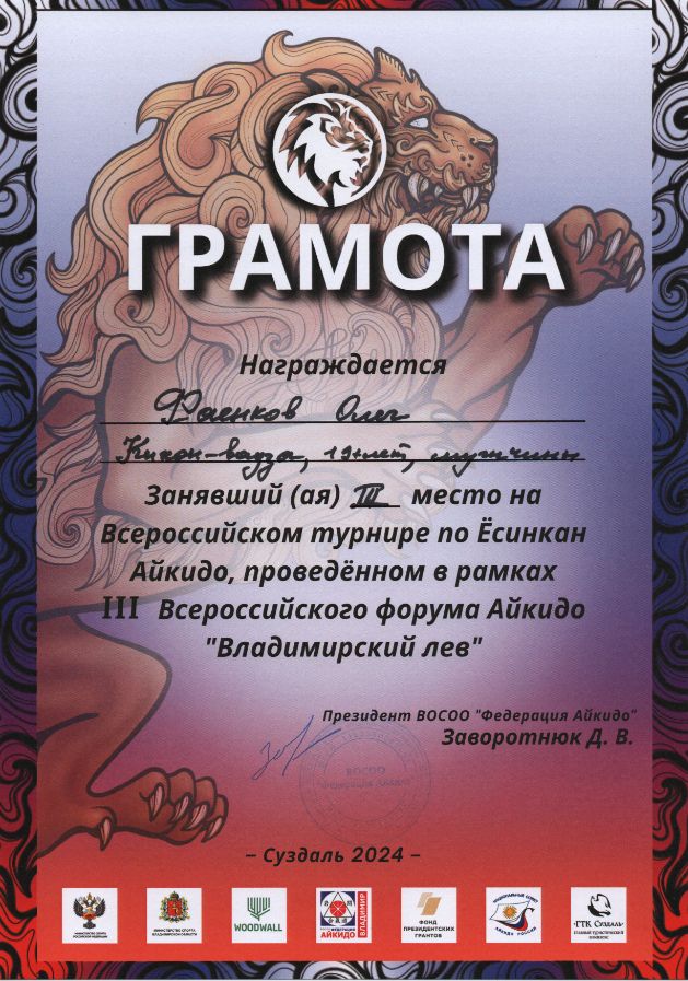 2024 г. - 3 место на Всероссийском турнире по Айкидо Ёсинкан, в категории "Кихон - ваза", Суздаль.